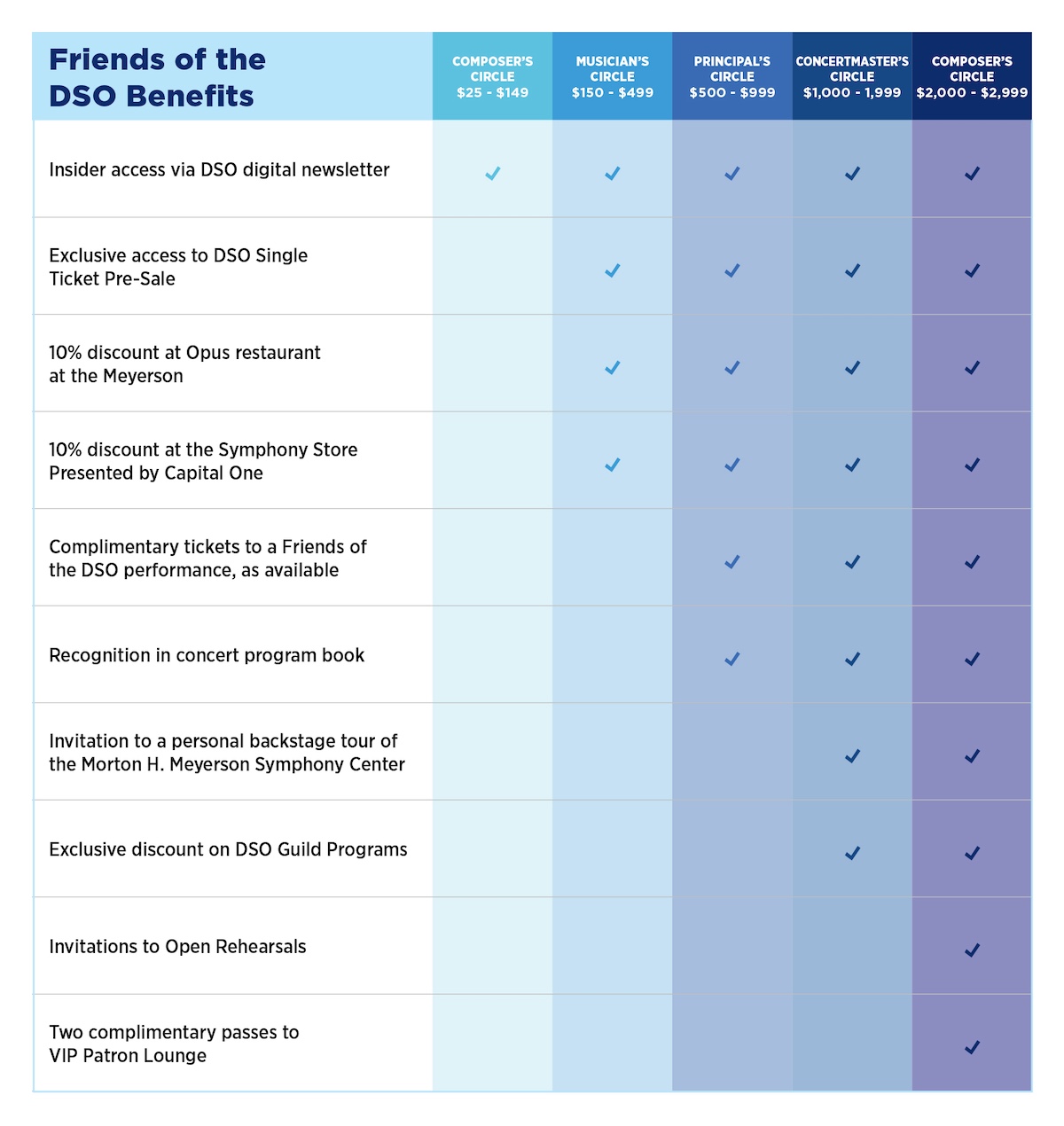The annual support of our Friends of the DSO funds core programs including the classical and pops series, education and community engagement programs, and the operation of the Meyerson Symphony Center. The generosity of the annual fund members has contributed to the success of the orchestra and its place in the arts community. These gifts have enabled us to expand our reach and impact in the Dallas community.