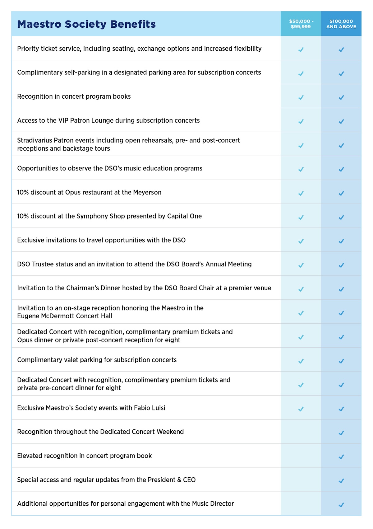 The contributions of Stradivarius and Maestro Society patrons are integral to the DSO annual fund and support the artistic excellence of the orchestra, as well as a myriad of DSO education programs. Patrons enjoy special benefits to enhance their concert experiences all season long, including opportunities to spend time with musicians, private receptions, the intermission lounge and unique digital content.
